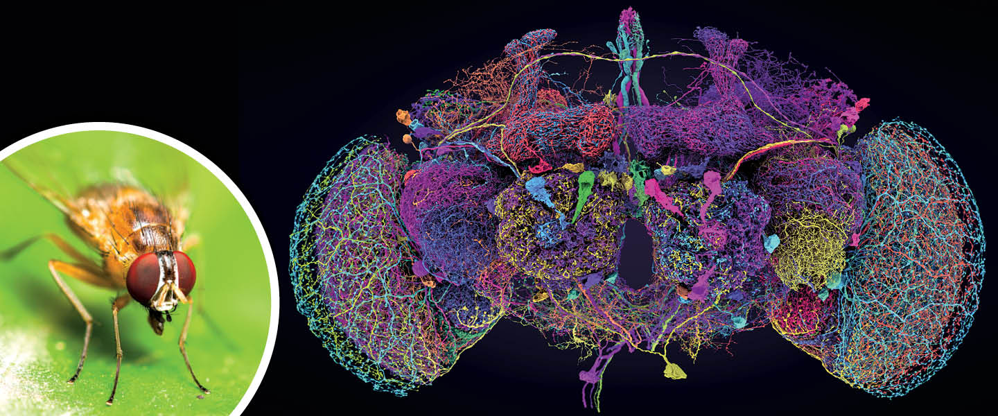 A complex map: The different colors represent distinct circuits of neurons that run throughout a fruit fly’s brain. Tyler Sloan and Amy Sterling for FlyWire at Princeton University (brain); Alongkot Sumritjearapol/Getty Images (fly)