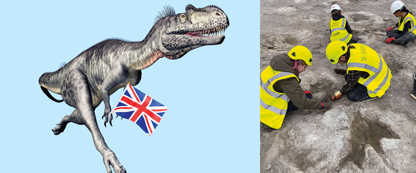 Scientists document the dinosaur prints in detail. Shutterstock.com (dinosaur, flags); Courtesy of Emma Nicholls (scientists)