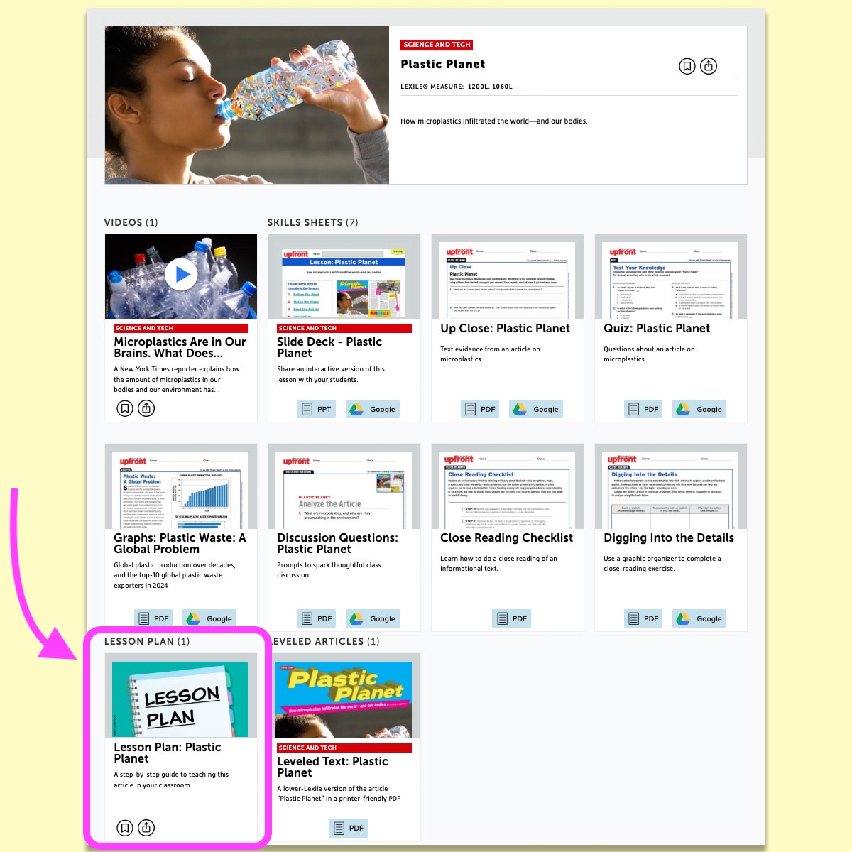 You can download the Teacher’s Guide from the Issue Page, and you can find the individual Lesson Plans listed underneath each article.