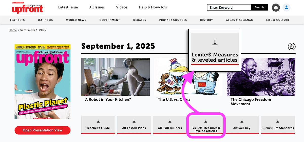 Differentiation starts with the text itself. And every featured article in Upfront comes with a lower-lexile version for your classroom. You can download all the leveled articles for your newest issue with just one click. From your issue page, click the Lexile Measures tile underneath the featured resources.