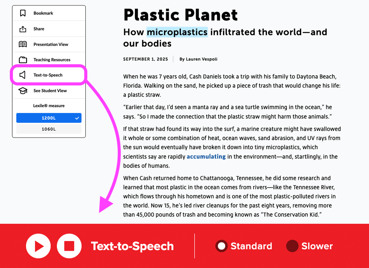 While you’re there, check out our new Text-to-Speech tool. This tool can read aloud the text of an article. It highlights the text as you go, so developing readers can better follow along. And there are two speeds, so students can slow it down if necessary.