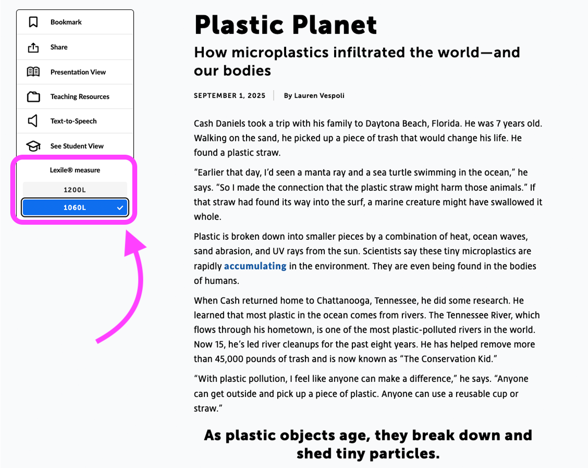 You can also change the reading level when you’re looking at an article online. Just click the reading level you want in this toolbar on the left.